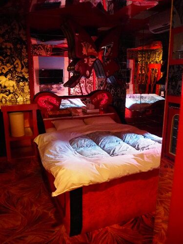そこは燃えるような赤い部屋だった。 この令和の時代にこんなにも純度の高いギラギラとした昭和ラブホがあるのは奇跡みたいなものである。 のぼりがはためくホテルの外観。 こういうふうに営業していることをアピールされるとほっとする。 ラブホお得意のビ…